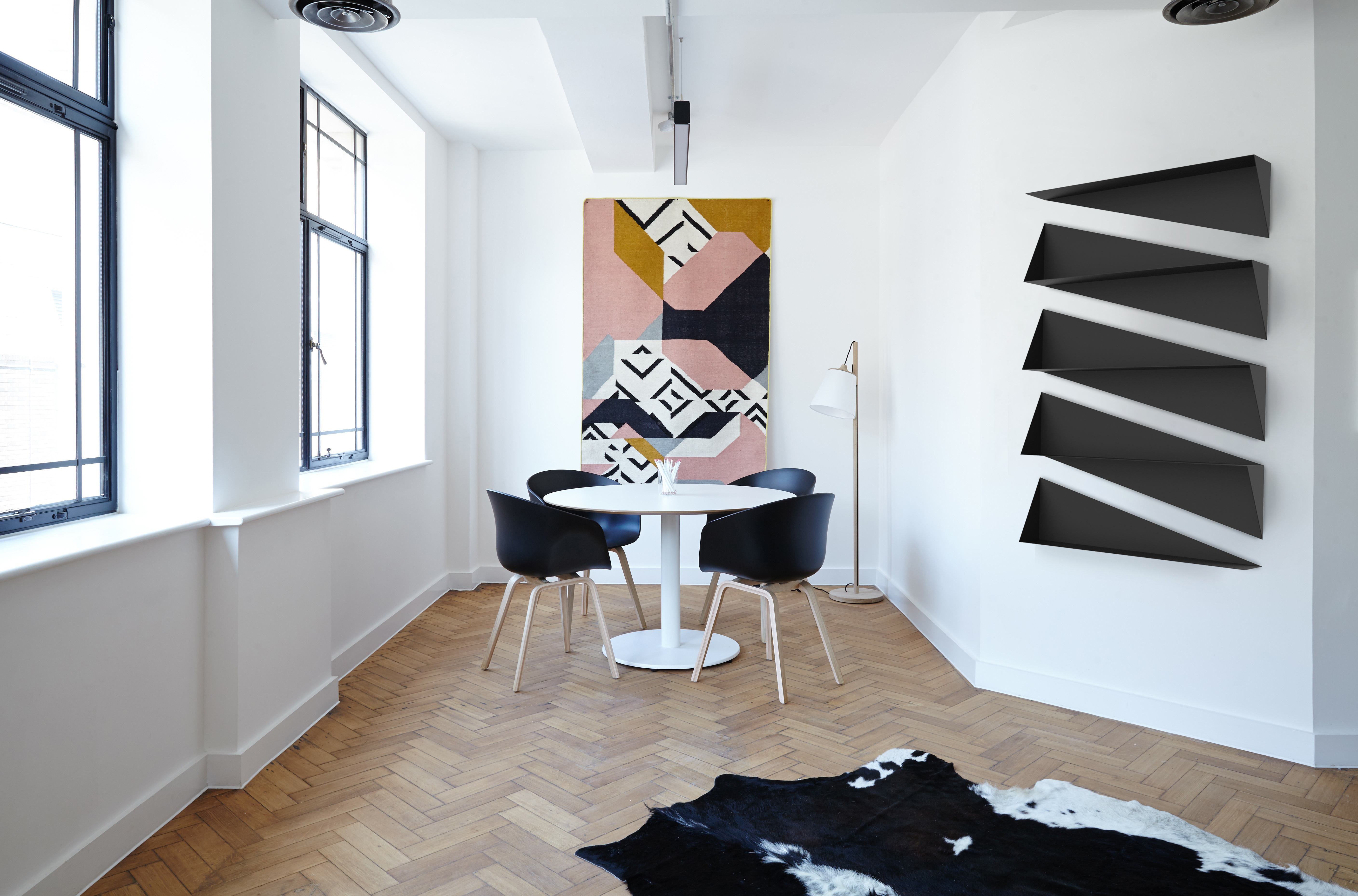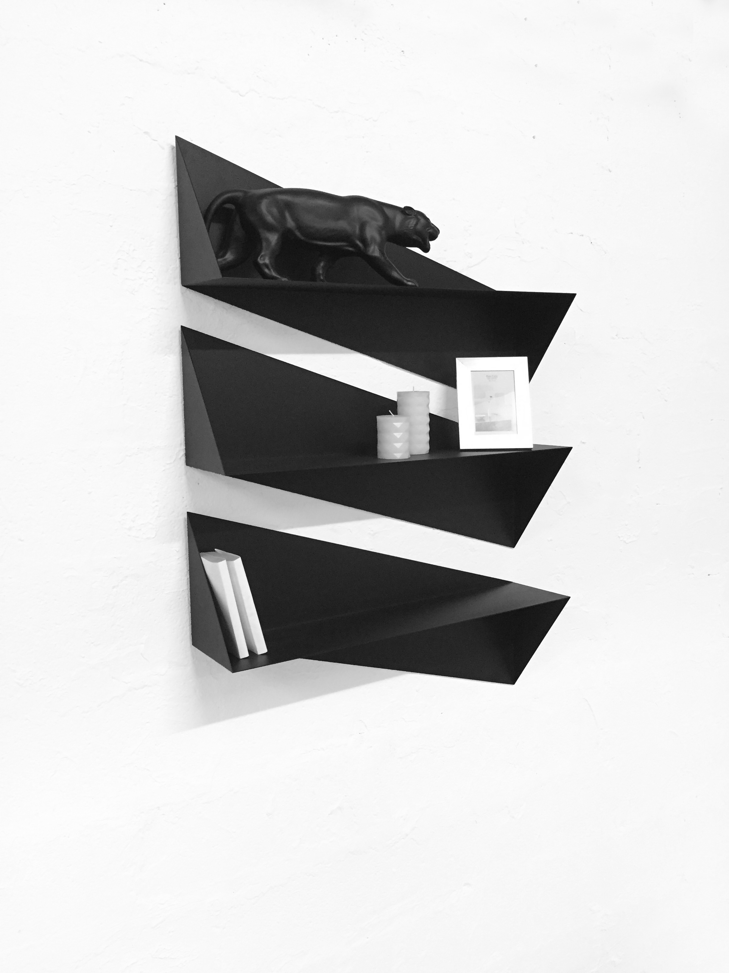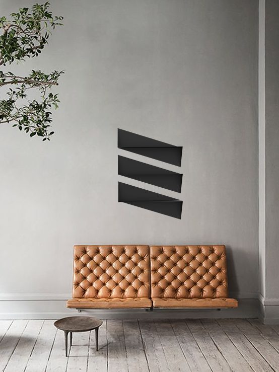L’étagère vient rompre nos habitudes visuelles et impact par son illusion d’inclinaison.